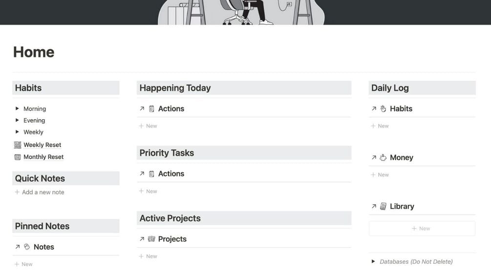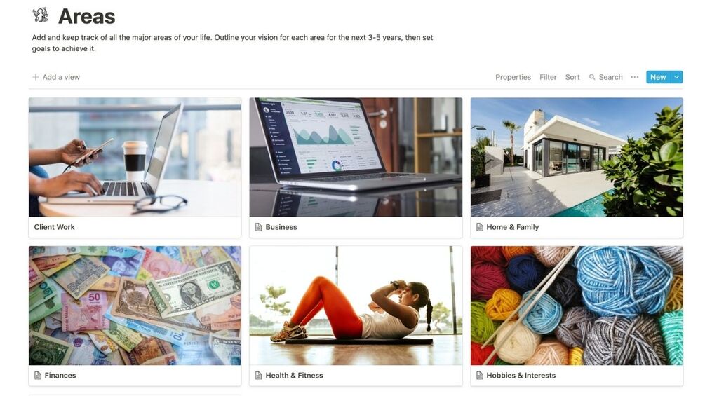 8 databases to manage it all: Areas, Goals, Projects, Habits, Actions (includes Calendar), Library, Money, Notes